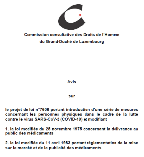 Avis de la Commission consultative des Droits de l'HommeDans son avis du 9 juin 2020, la CCDH se félicite de l'approche du gouvernement qui consiste à donner un cadre légal aux mesures qui visent à protéger la santé publique dans le cadre de COVID-19. Or, elle estime que les dispositions prévues manquent de précision en ce qui concerne notamment leurs modalités et les garanties prévues pour éviter des abus.